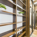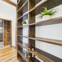 Przestronny korytarz z biblioteką i zabudową szaf