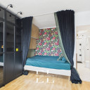 • Salon z częścią sypialnianą (ok. 16 m²)- ustawny pokój z dużymi oknami od strony południowej. Przy oknie długi blat do pracy lub nauki, wygodny fotel biurowy, sofa oraz liczne szafy w zabudowie. W głębi wydzielona strefa sypialni z łóżkiem w wnęce, którą można zasłonić zasłonami, dzięki czemu przestrzeń pozostaje uporządkowana na co dzień.