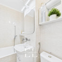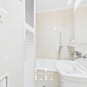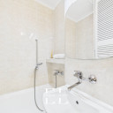 • Łazienka (ok. 2 m²) - z wanną, umywalką z szafką, WC oraz lustrem z półkami. Utrzymana w jasnych, neutralnych płytkach.